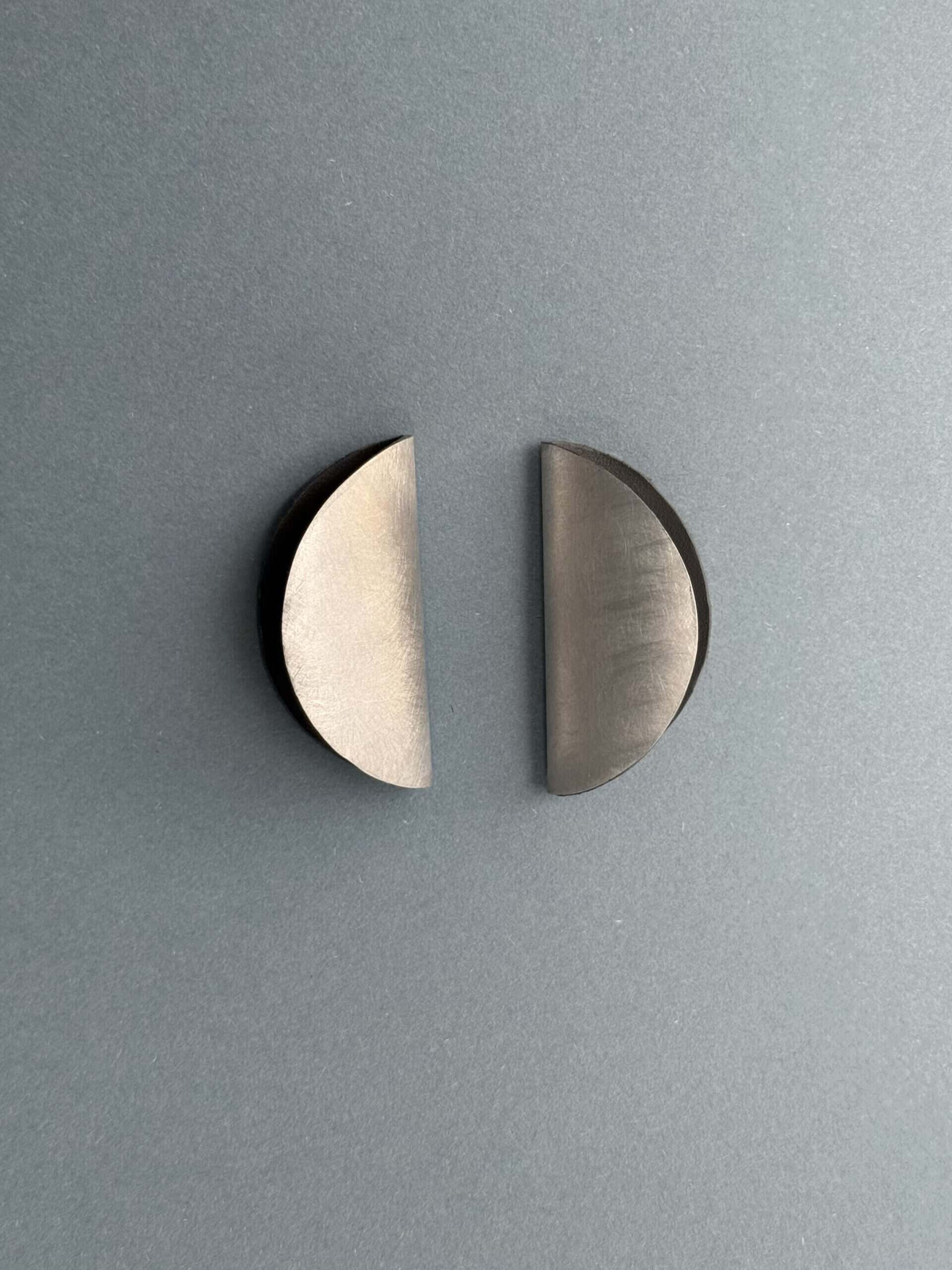 Aluminium użyte w kolczykach pochodzi z puszek, lecz po obróbce zyskuje zupełnie nowy charakter. Powierzchnia półkola zostaje starannie wyszlifowana, dlatego delikatnie przypomina matowy blask białego złota. Forma jest prosta, ale jednocześnie nowoczesna, co sprawia, że kolczyki tworzą wyrazisty akcent stylizacji.