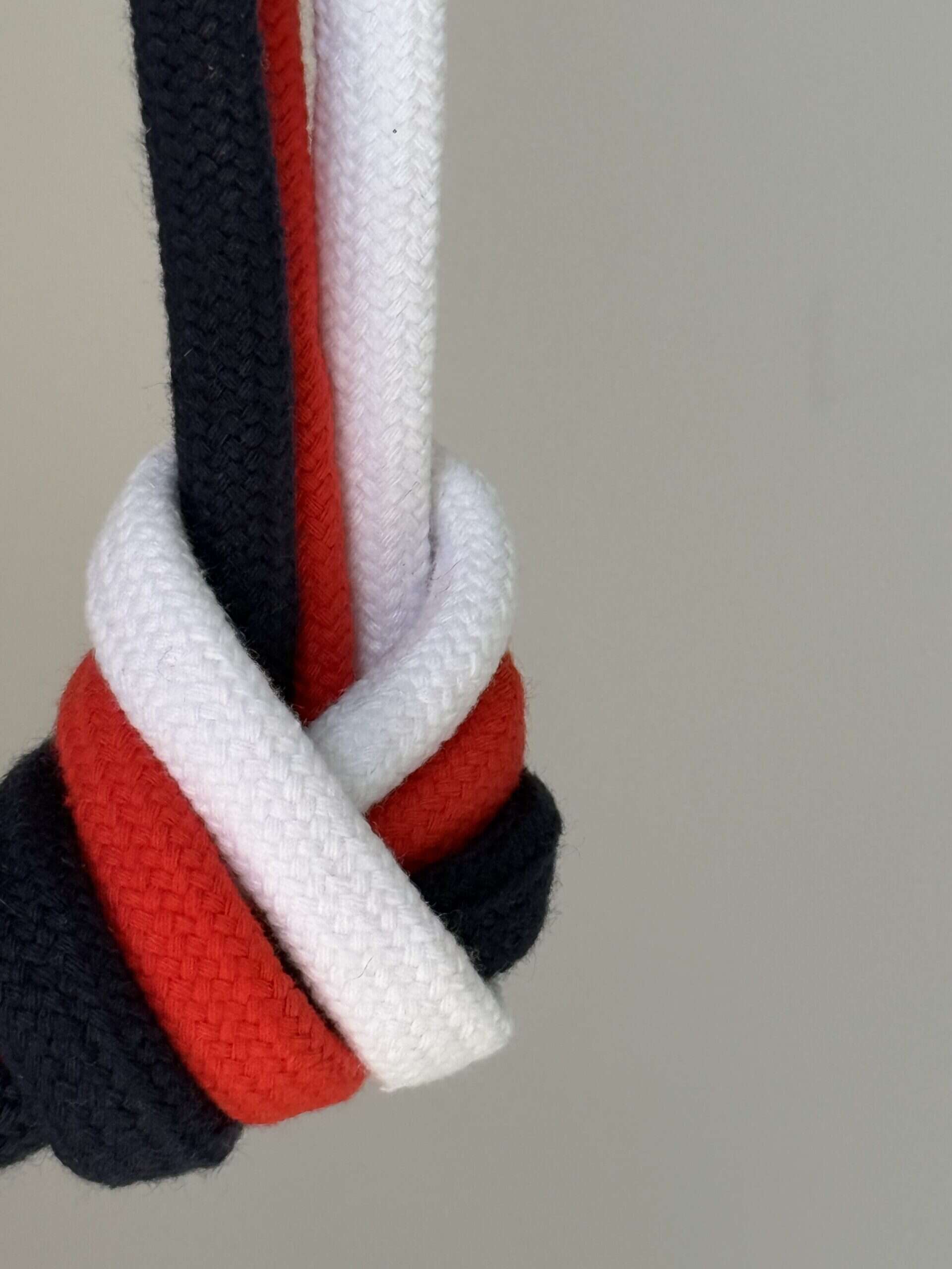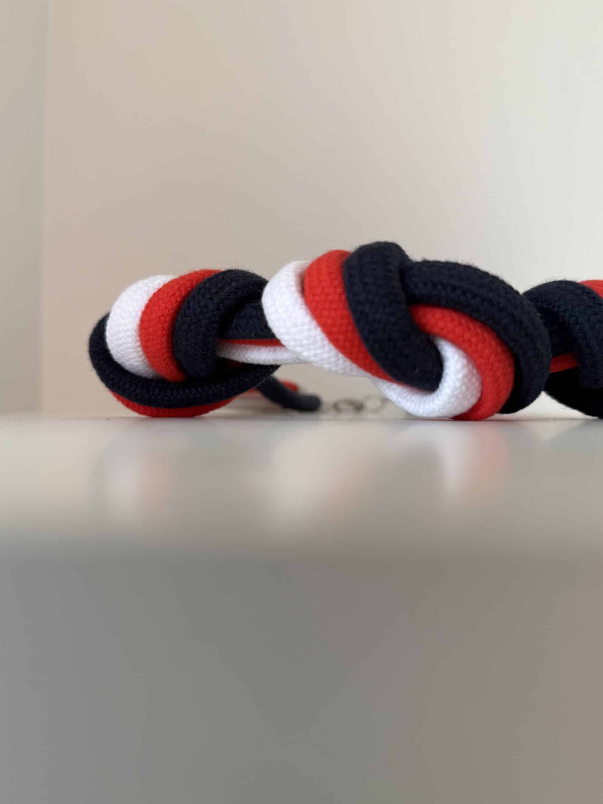 To paleta marynistyczna (nautical / navy) – klasyczna, kontrastowa trójkolorowa (granat jako baza, biel jako „światło”, czerwień jako akcent). Węzły pozostają charakterystycznym znakiem kolekcji TRIO, dlatego model wyróżnia się na tle innych dodatków.