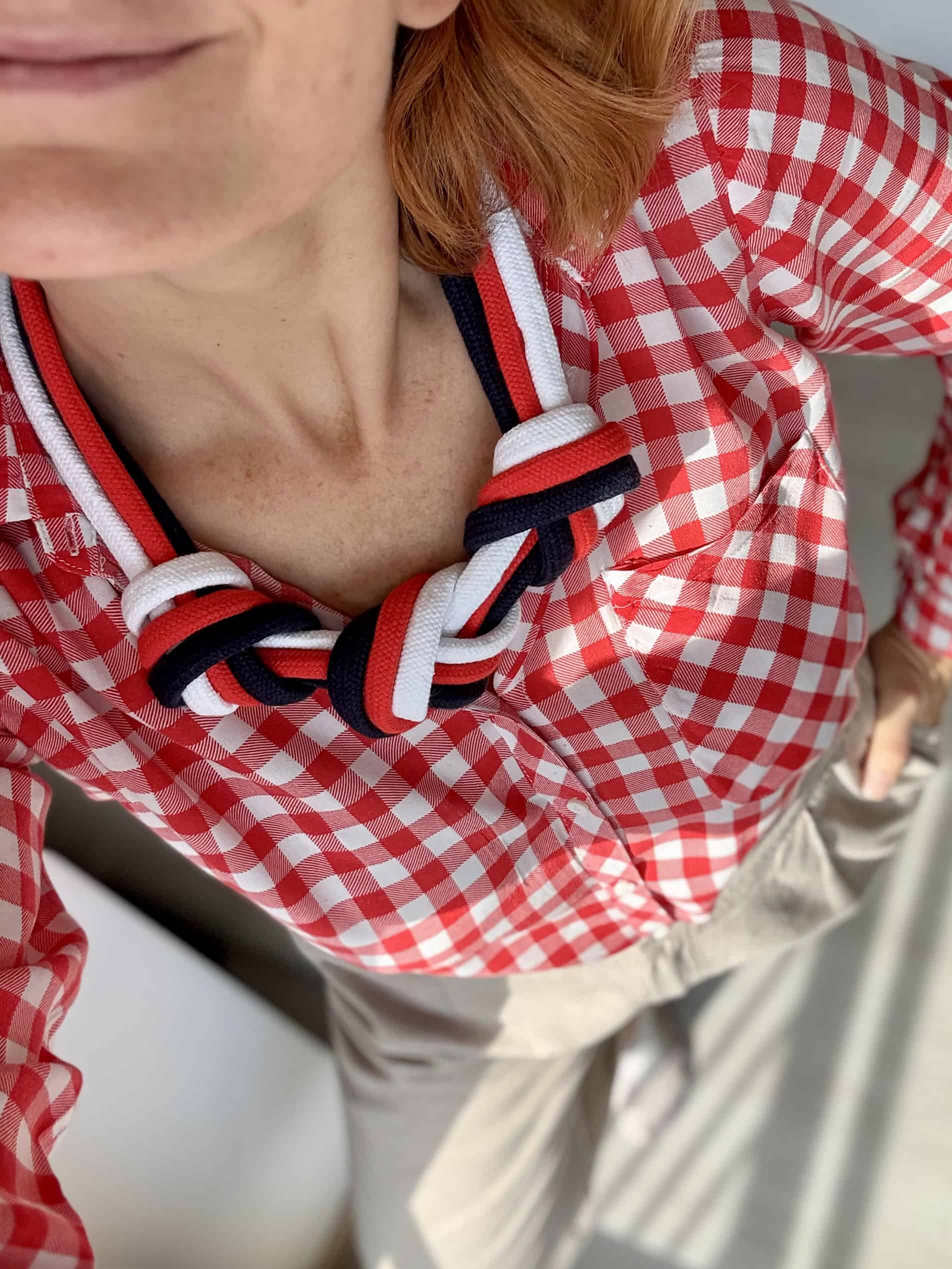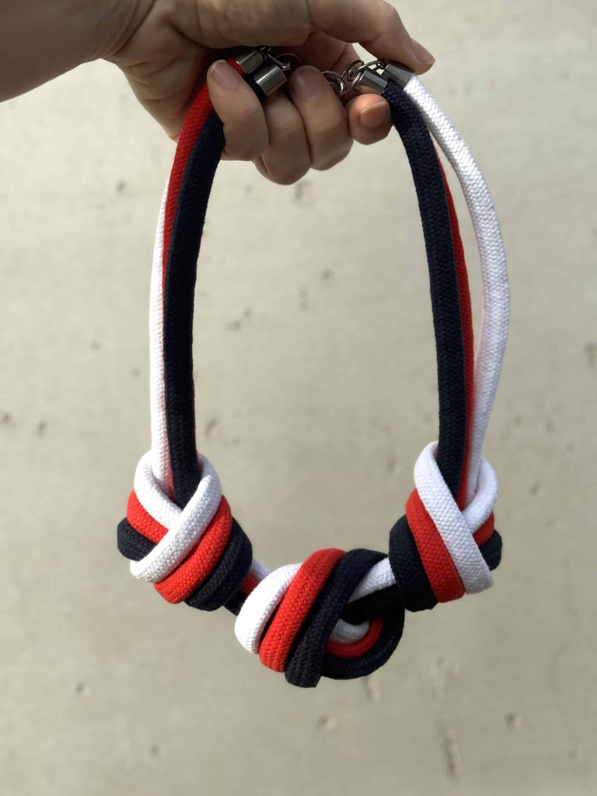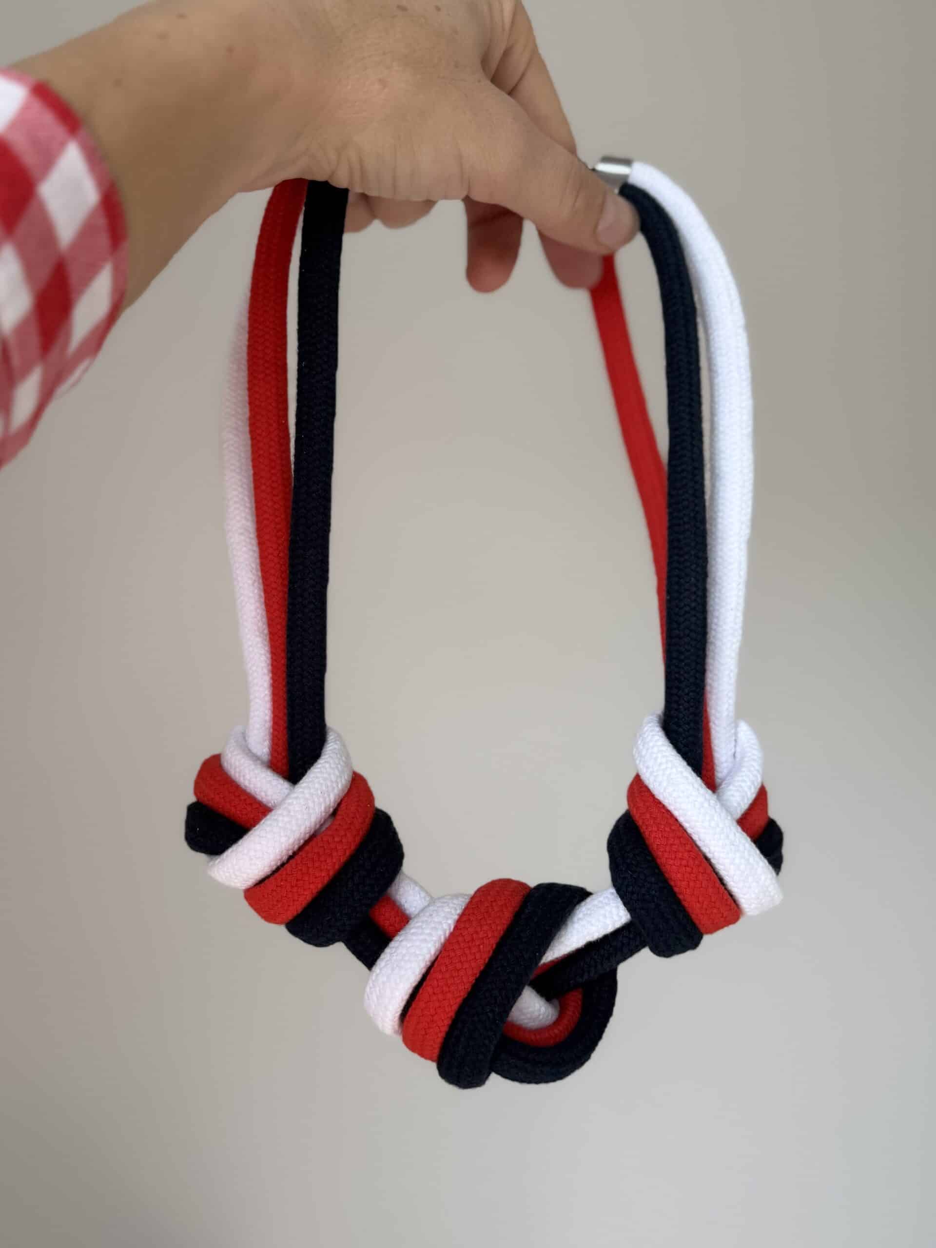 Naszyjnik bawełniany TRIO – czerwony, biały, granatowy | ręcznie robiony sznurkowy naszyjnik Made By Mila