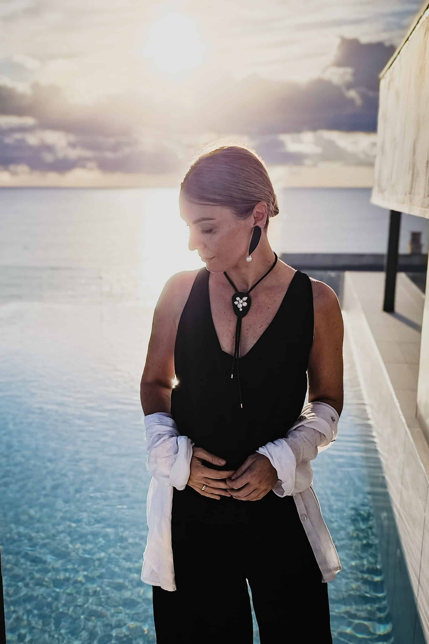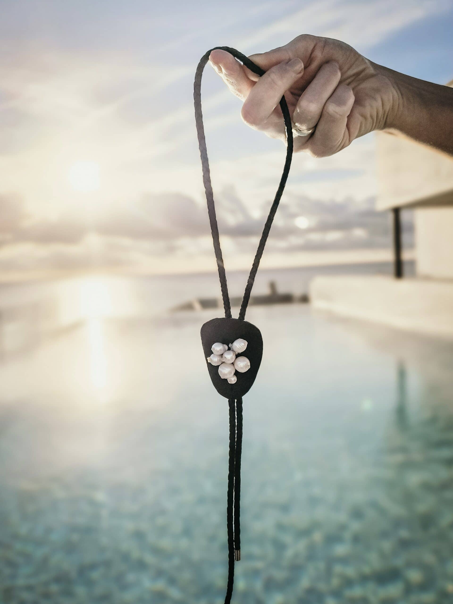 Naszyjnik zakłada się jednym ruchem – wystarczy zsunąć element z perłami, by dopasować długość i ułożyć BOLO idealnie na szyi.