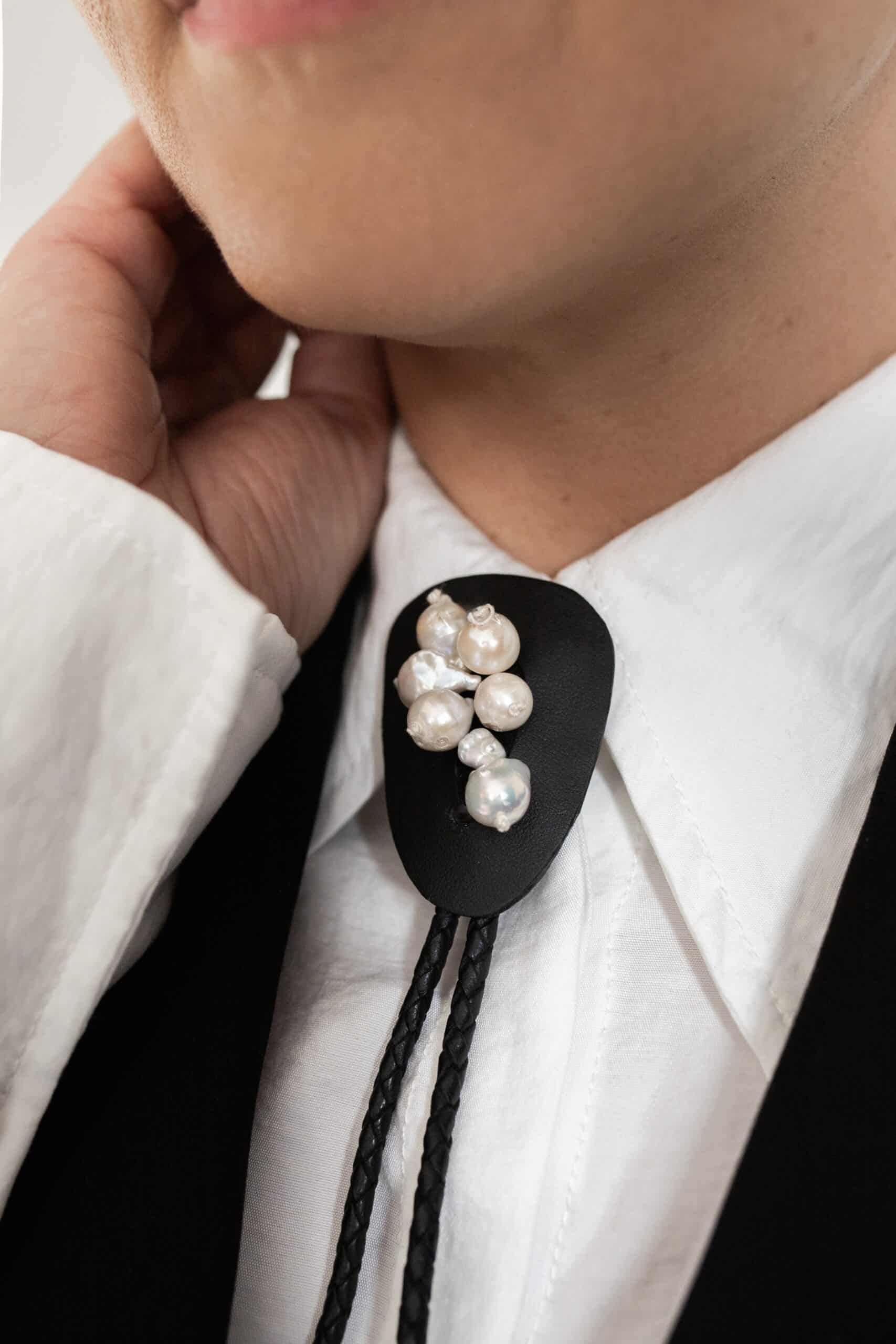 Naszyjnik skórzany BOLO z perłami barokowymi – artystyczna krawatka z naturalnej skóry