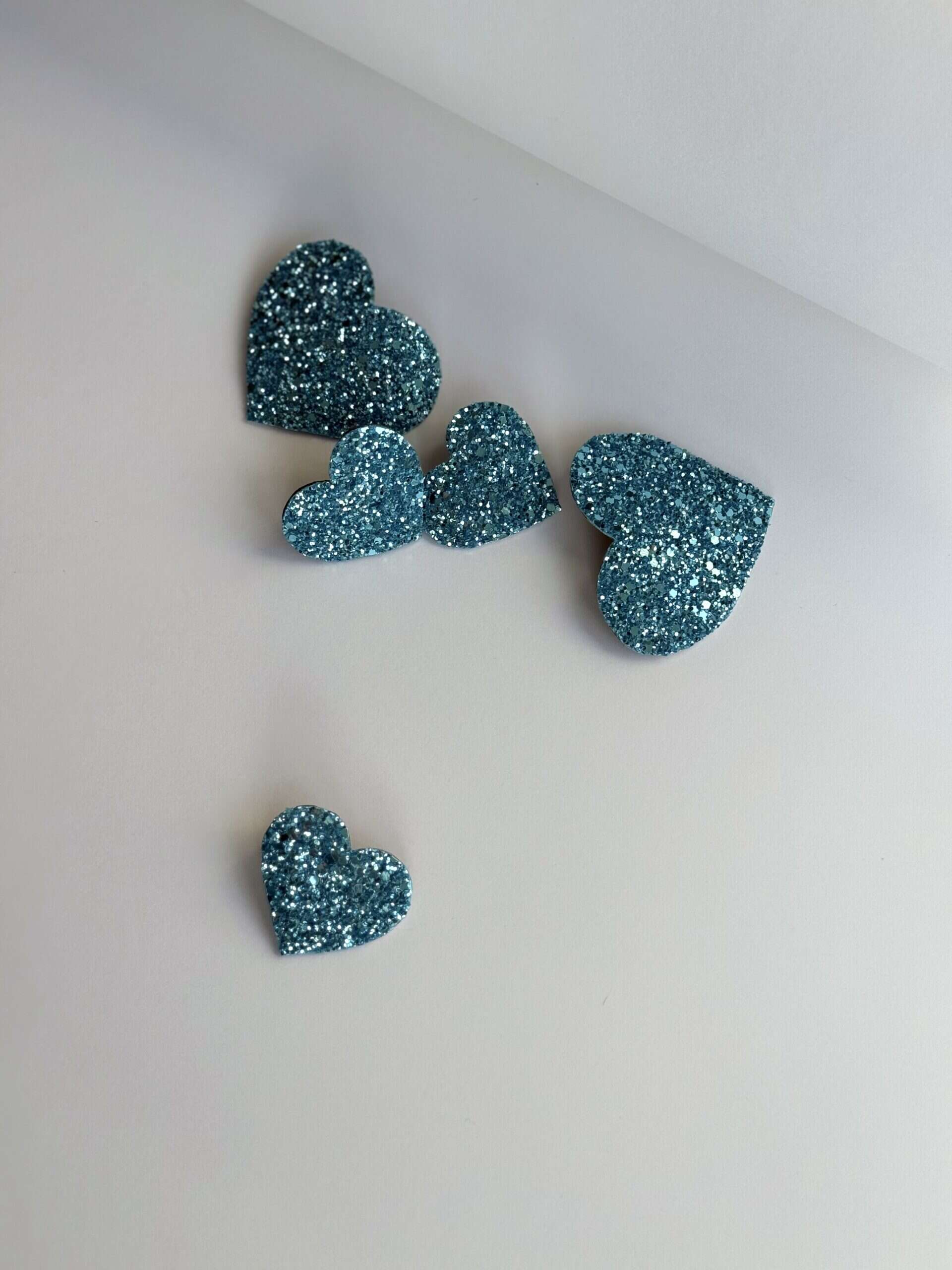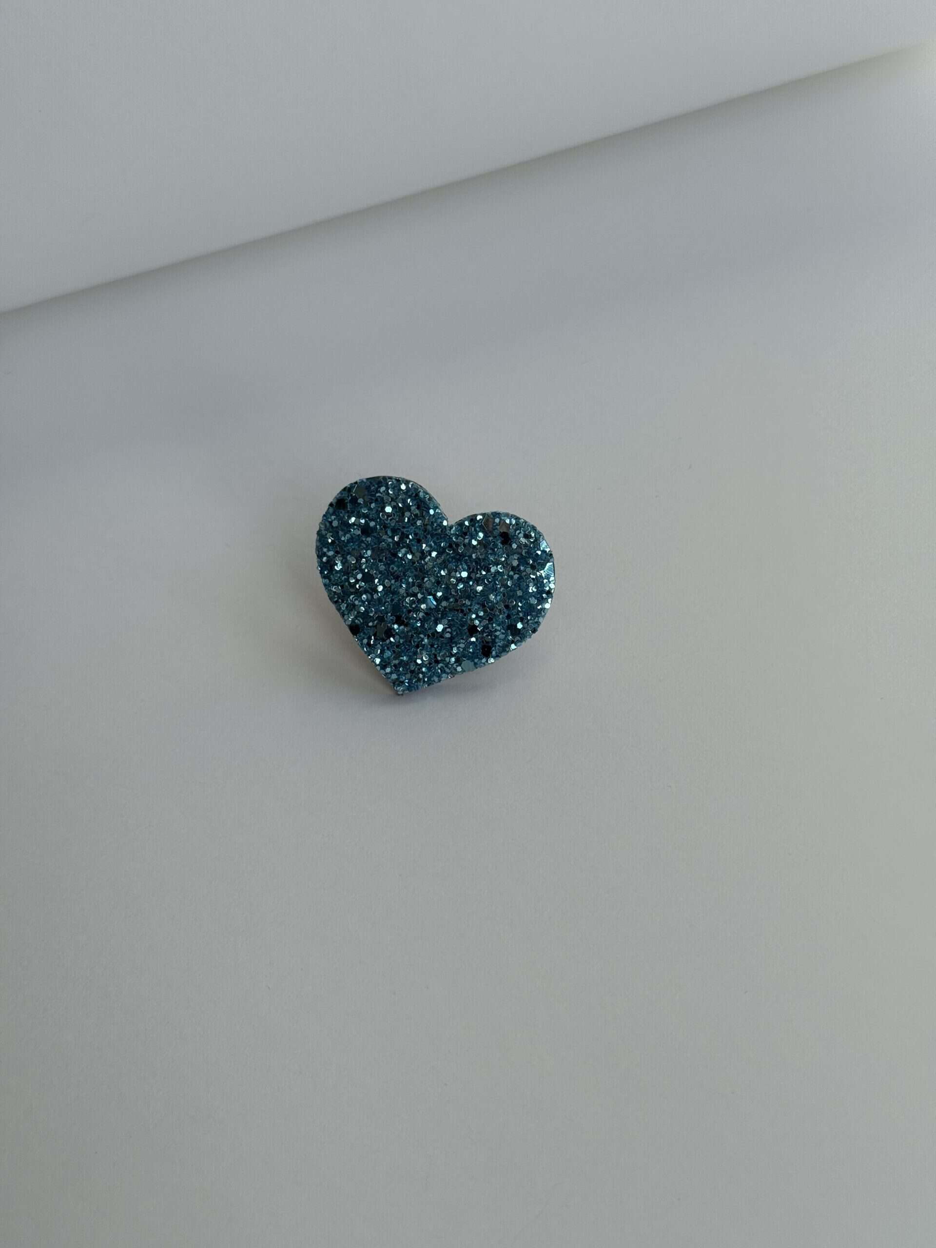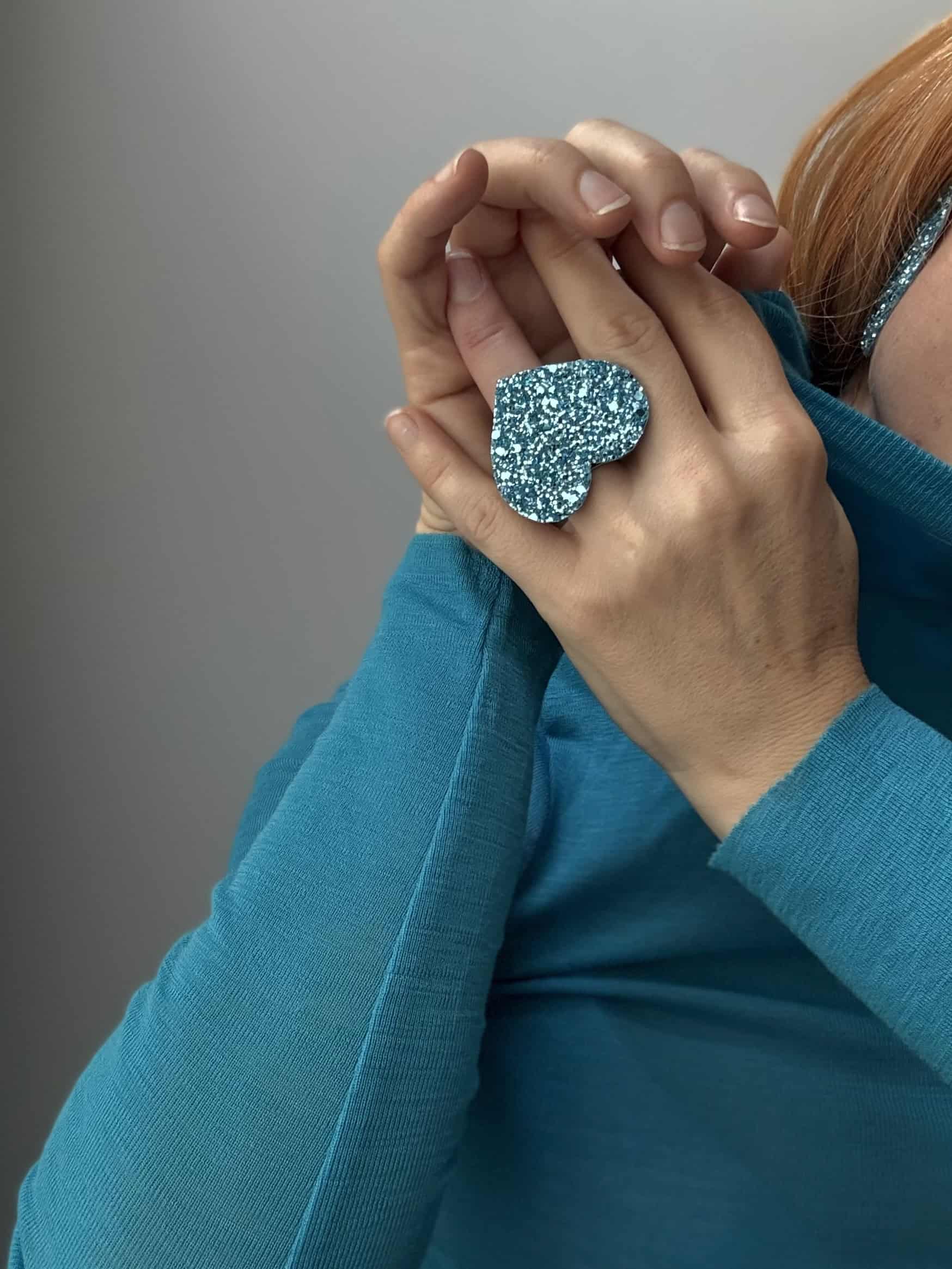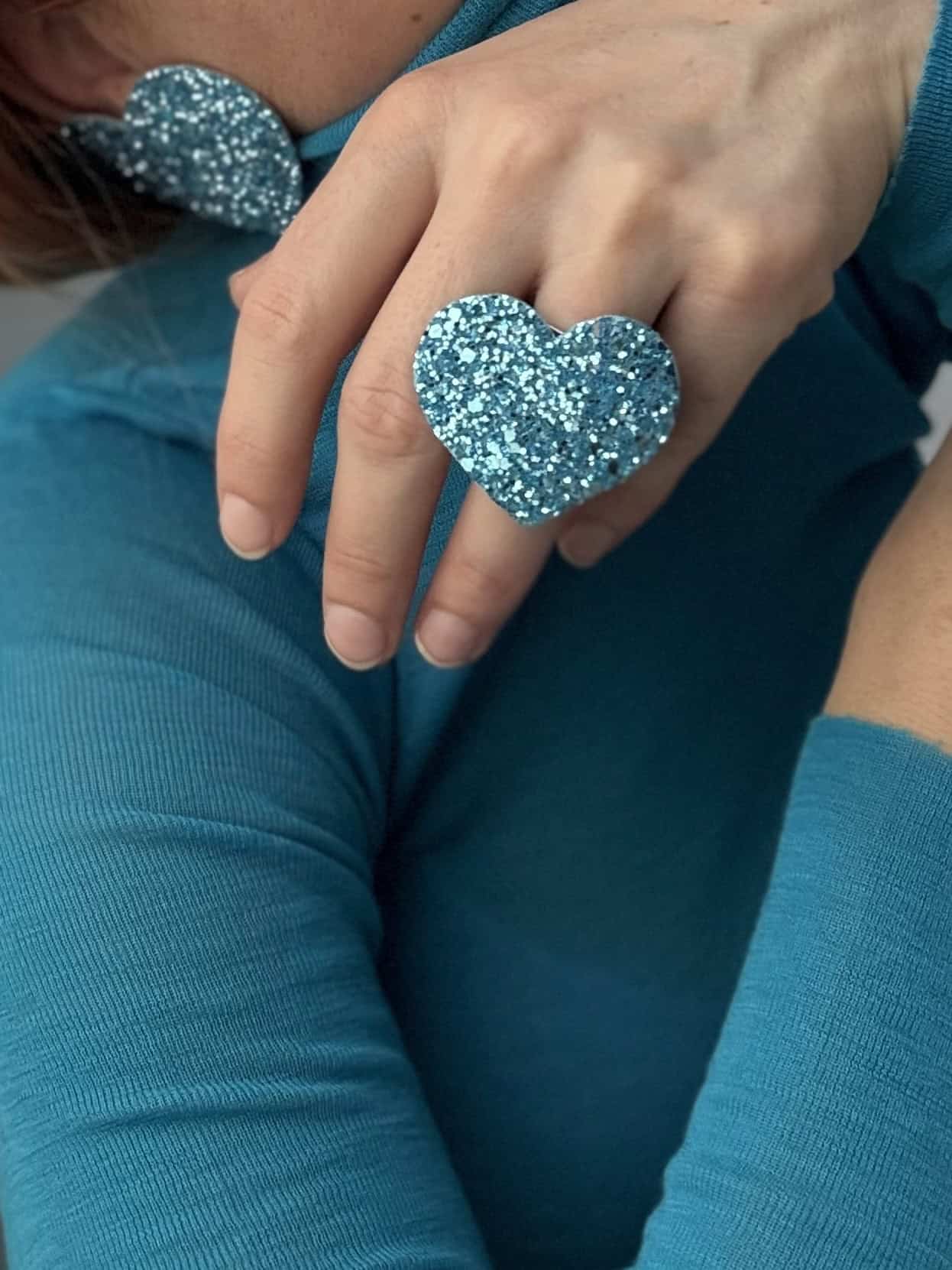 Pierścionek brokatowy LOVE lazurowy dodaje blasku i pewności. Ma serce 3,5 cm (1.38 in), regulowany rozmiar i bazę ze stali szlachetnej. Podklejam go skórą, dlatego zostaje z Tobą na lata.
